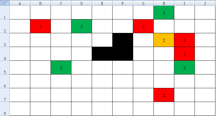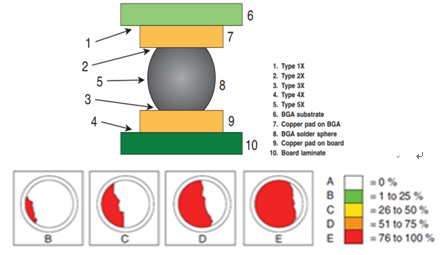 對(duì)于存在染色的器件,試驗(yàn)結(jié)果一般選用如下圖1所示的“染色點(diǎn)位分布”來(lái)呈現(xiàn)。其中,方格表示器件所有焊點(diǎn)的分布;黑色方格表示此處不存在焊點(diǎn);白色方格表示此處焊點(diǎn)無(wú)異常不存在染色;綠、黃、橙、紅方格表示此處焊點(diǎn)存在染色(不同顏色代表不同染色面積占比,如下圖2);方格內(nèi)數(shù)字(1、2、3、4、5)表示此處染色焊點(diǎn)的斷裂模式(如下圖2)