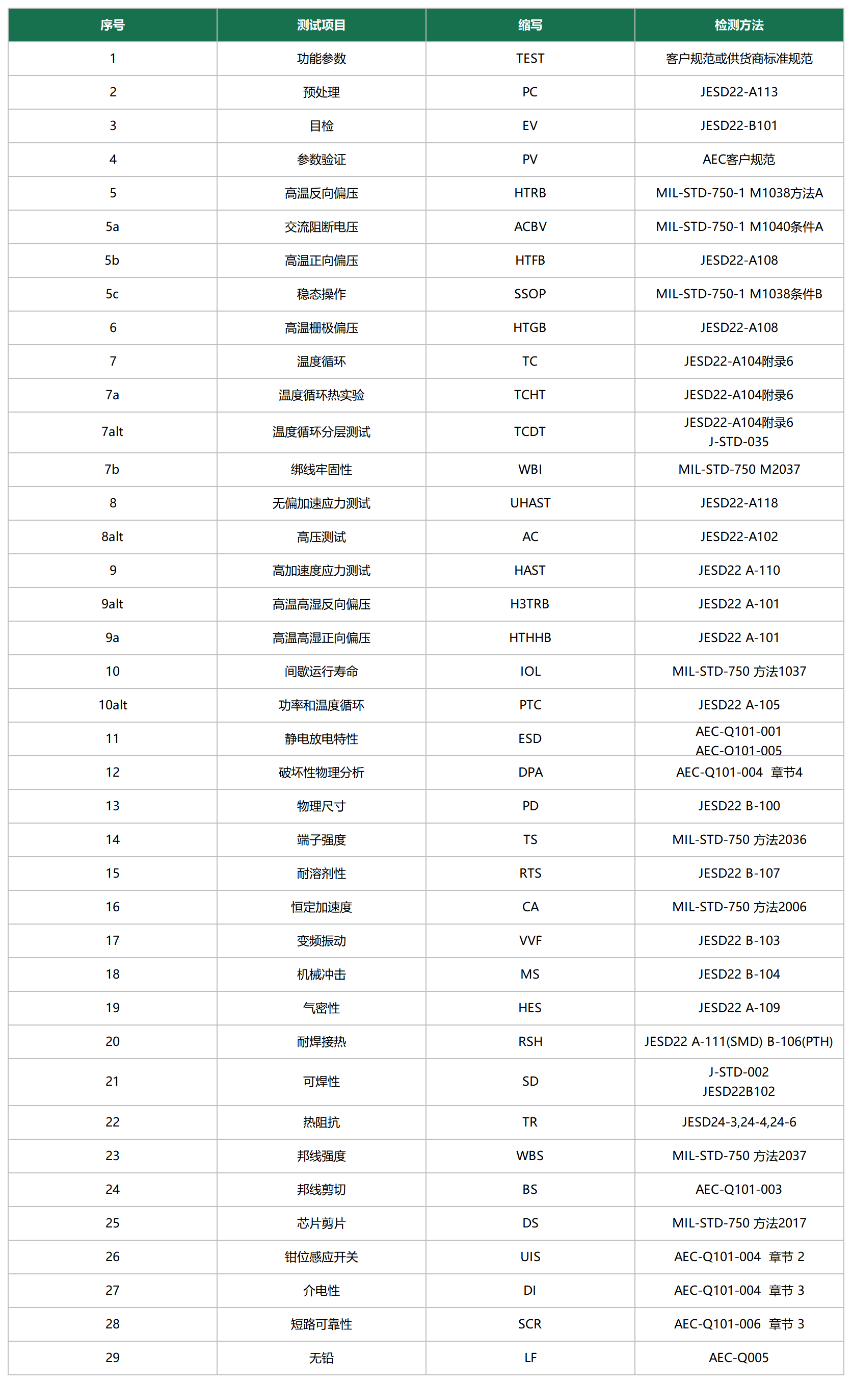 AEC Q101是基于失效機(jī)理的離散半導(dǎo)體元件應(yīng)力測(cè)試鑒定,由AEC委員會(huì)制定,適用于車(chē)用離散半導(dǎo)體元件的綜合可靠性測(cè)試認(rèn)證標(biāo)準(zhǔn),是離散半導(dǎo)體元件應(yīng)用于汽車(chē)領(lǐng)域的基本門(mén)檻。首版于1996年發(fā)行,并持續(xù)更新到2021年的E版本,也是目前沿用的* 新標(biāo)準(zhǔn)。AEC Q101標(biāo)準(zhǔn)是離散半導(dǎo)體元件(依產(chǎn)品類(lèi)型、封裝形貌及取樣數(shù)量的要求)執(zhí)行并通過(guò)的必要測(cè)試項(xiàng)目。